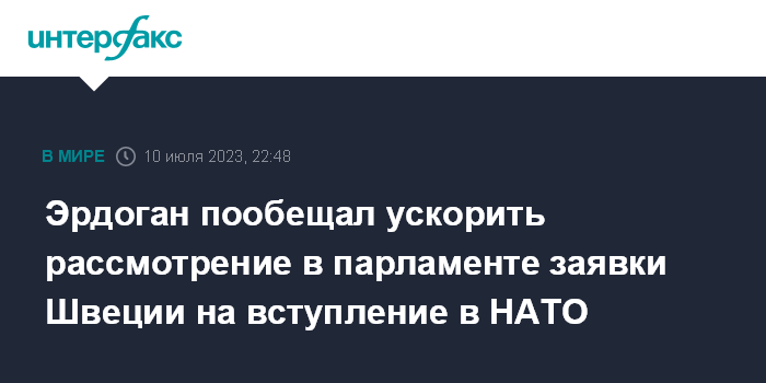 Москва. 10 июля. INTERFAX.RU - Президент Турции Реджеп Тайип Эрдоган дал согласие на то, чтобы быстрее направить на голосование в турецкий парламент заявку Швеции на вступление в НАТО, заявил в понедельник генсек альянса Йенс Столтенберг.
