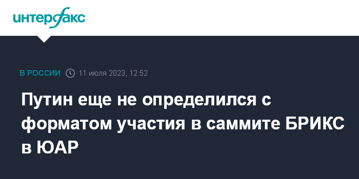 Москва. 11 июля. INTERFAX.RU - Президент РФ Владимир Путин пока не определился с форматом участия в саммите БРИКС, намеченном на август этого года в Йоханнесбурге (ЮАР). Об этом сообщил журналистам пресс-секретарь главы государства Дмитрий Песков.