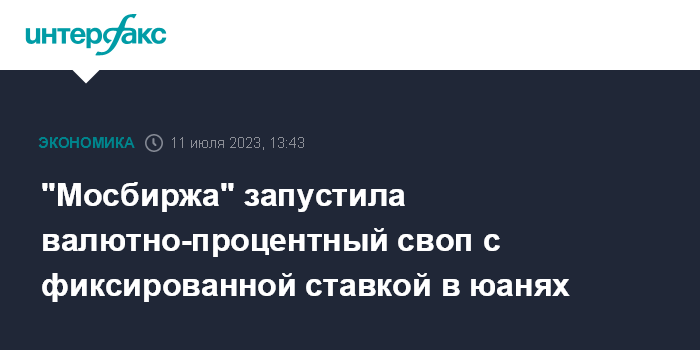 Москва. 11 июля. INTERFAX.RU - Участникам рынка стандартизированных производных финансовых инструментов (СПФИ) "Московской биржи" стал доступен валютно-процентный своп с фиксированной ставкой в китайских юанях на сроки от трех дней до пяти лет, сообщила торговая площадка.