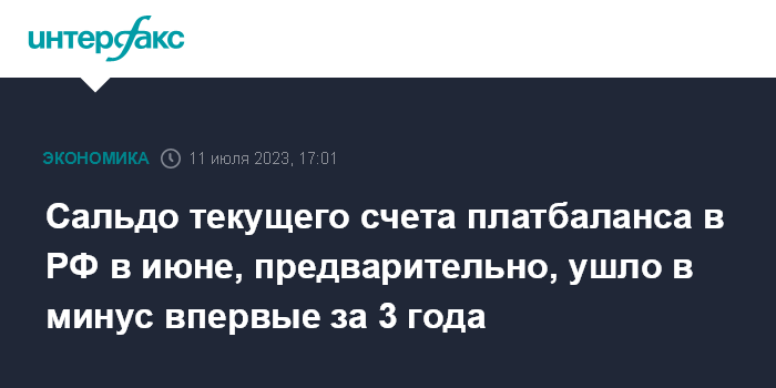 Сальдо текущего счета платбаланса в РФ в июне, предварительно, ушло в минус впервые за 3 года