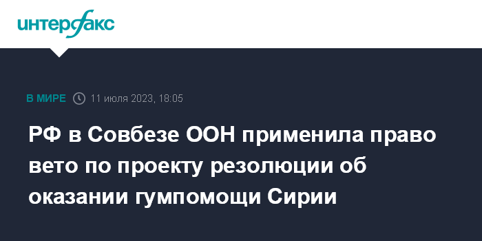 Москва. 11 июля. INTERFAX.RU - Россия в Совбезе ООН заветировала новый проект резолюции СБ ООН о продлении на девять месяцев трансграничного механизма оказания гуманитарной помощи Сирии.