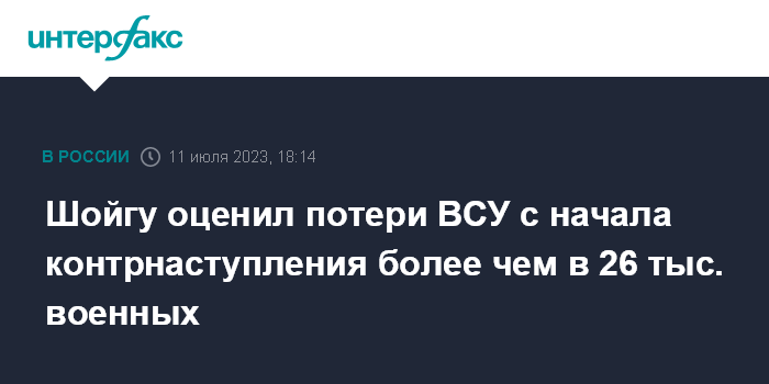 Москва. 11 июля. INTERFAX.RU - За время контрнаступления Украины с 4 июня потери ВСУ составили более 26 тыс. человек и трех тысяч различной военной техники, включая поставленные Западом танки Leopard, АМХ и БМП Bradley, заявил министр обороны РФ Сергей Шойгу.
