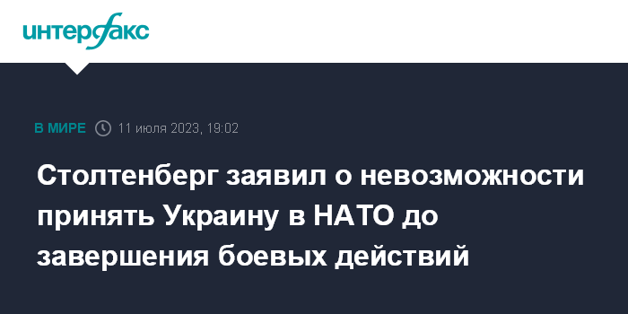 Москва. 11 июля. INTERFAX.RU - Все страны НАТО придерживаются точки зрения, что Украину нельзя принять в организацию, пока в этой стране идут боевые действия, заявил генсек альянса Йенс Столтенберг.