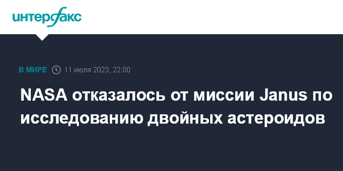 Москва. 11 июля. INTERFAX.RU - Национальное управление США по аэронавтике и исследованию космического пространства (NASA) заявило о прекращении работы над миссией аппаратов Janus, в рамках которой предполагалось исследование двойных астероидов.