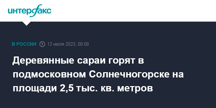 Москва. 12 июля. INTERFAX.RU - Деревянные постройки загорелись в подмосковном городе Солнечногорск, сообщили в пресс-службе МЧС РФ в среду.