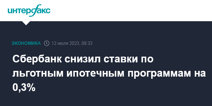 Москва. 12 июля. INTERFAX.RU - Сбербанк снизил ставки по "Господдержке" и "Семейной ипотеке" на 0,3 п.п, сообщили в пресс-службе банка.