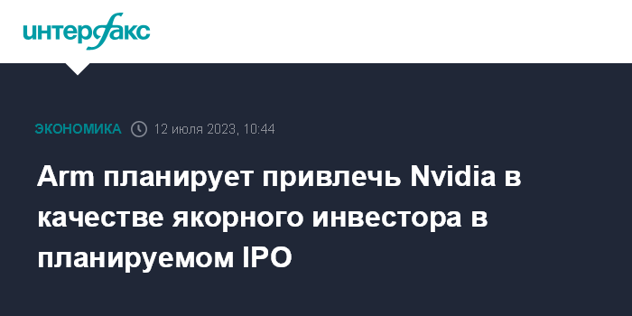 Москва. 12 июля. INTERFAX.RU - Британский разработчик чипов Arm, планирующий проведение IPO в Нью-Йорке в этом году, ведет переговоры с американской Nvidia Corp., которую рассчитывает привлечь в качестве якорного инвестора, пишет Financial Times.