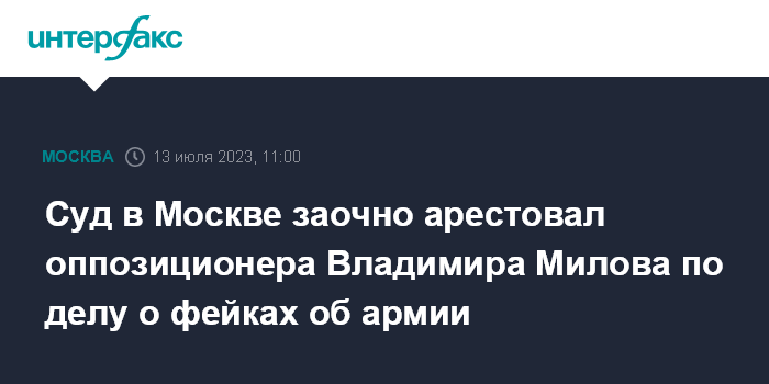 Москва. 13 июля. INTERFAX.RU - Басманный суд Москвы по ходатайству следствия заочно арестовал оппозиционера Владимира Милова (признан в РФ иноагентом) по делу о распространении фейков о Вооруженных силах РФ, сообщили "Интерфаксу" в пресс-службе суда.