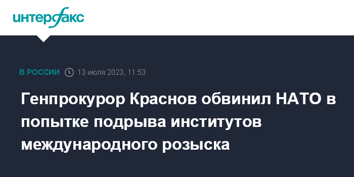 Москва. 13 июля. INTERFAX.RU - Страны НАТО прилагают значительные усилия для дестабилизации международного сотрудничества и подрыва институтов международного розыска и выдачи преступников, заявил в Пекине генпрокурор России Игорь Краснов. Он провел встречу с министром общественной безопасности КНР Ваном Сяохуном.