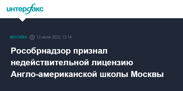 Москва. 13 июля. INTERFAX.RU - Лицензия автономной некоммерческой общеобразовательной организации "Англо-американская школа Москвы" (ААШ, включена в реестр иностранных агентов) признана недействительной распоряжением Рособрнадзора от 12 июля 2023 года, следует из ведомственного реестра лицензий образовательных организаций.