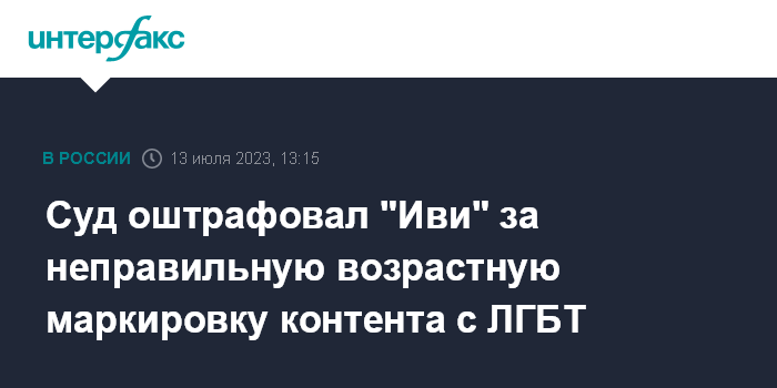 Москва. 13 июля. INTERFAX.RU - Останкинский суд Москвы назначил штраф в 1 млн рублей онлайн-кинотеатру "Иви" за демонстрацию ЛГБТ-контента среди несовершеннолетних, сообщили "Интерфаксу" в суде.
