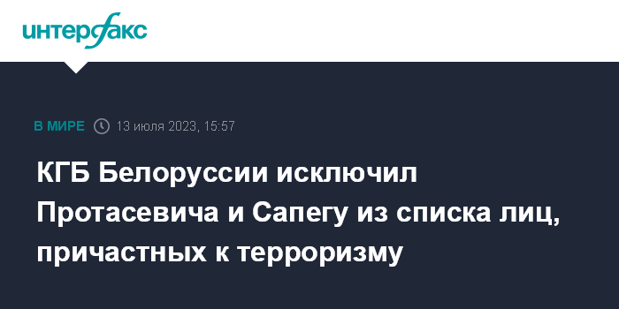 Москва. 13 июля. INTERFAX.RU - Комитет государственной безопасности Белоруссии исключил из перечня организаций и физических лиц, причастных к террористической деятельности, ранее помилованных президентом республики Романа Протасевича и Софию Сапегу.