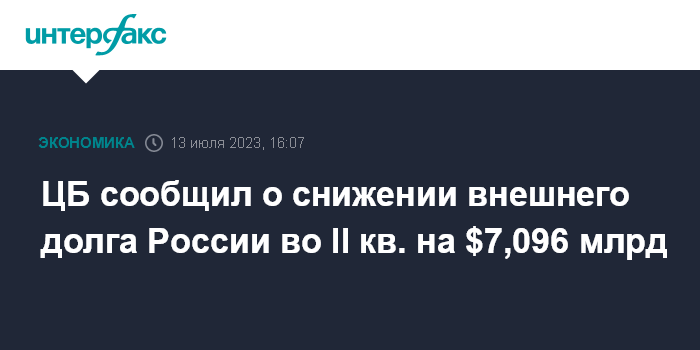 Москва. 13 июля. INTERFAX.RU - Внешний долг РФ во втором квартале 2023 года уменьшился на $7,096 млрд, или на 2,0%, до $347,655 млрд, сообщается в информации, размещенной на сайте ЦБ РФ.