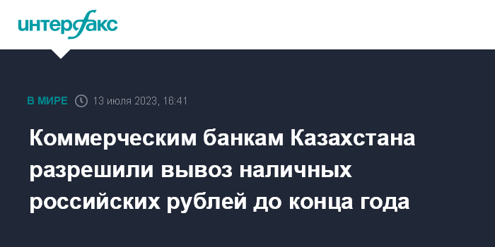 Москва. 13 июля. INTERFAX.RU - Правительство Казахстана приняло постановление, разрешающее банкам второго уровня (БВУ, коммерческие банки - ИФ) вывоз из республики наличных российских рублей.