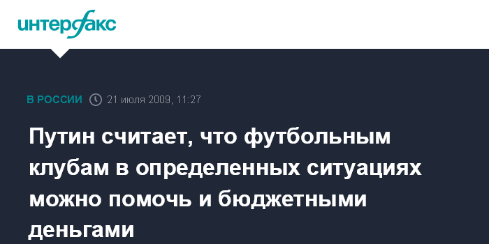 Москва. 21 июля. INTERFAX.RU - Премьер-министр РФ Владимир Путин не исключает возможности оказания бюджетной помощи футбольным клубам, оказавшимся в сложной ситуации.