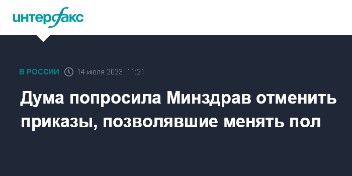 Москва. 14 июля. INTERFAX.RU - Госдума в пятницу наряду с принятием закона о запрете смены пола в РФ приняла постановление с обращением к министерству здравоохранения об отмене действующих нормативных документов, регулирующих выдачу разрешений на смену пола.