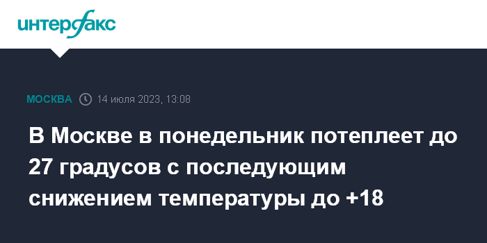 Москва. 14 июля. INTERFAX.RU - Волнообразная погода из-за циклона прогнозируется в ближайшие дни в Москве, после холодных дней к понедельнику температура повысится до плюс 27 градусов, в среду столбики термометров опустятся до плюс 18 - плюс 23.
