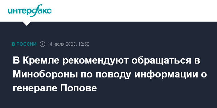 "Мы не комментируем, все-таки речь идет о военных, о министерстве обороны, поэтому за комментариями мы рекомендуем туда обращаться", - сказал пресс-секретарь президента РФ Дмитрий Песков журналистам, отвечая на вопрос, как в Кремле относятся к заявлениям Попова.