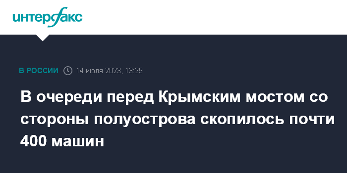 Москва. 14 июля. INTERFAX.RU - Очередь перед Крымским мостом со стороны полуострова выросла почти до 400 машин, сообщает телеграм-канал, освещающий ситуацию на автомобильных подходах к мосту.