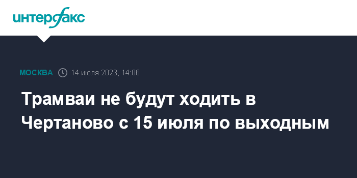 Москва. 14 июля. INTERFAX.RU - Маршруты трамваев в московском районе Чертаново не будут работать с 15 июля по выходным, сообщается в телеграм-канале столичного департамента транспорта.