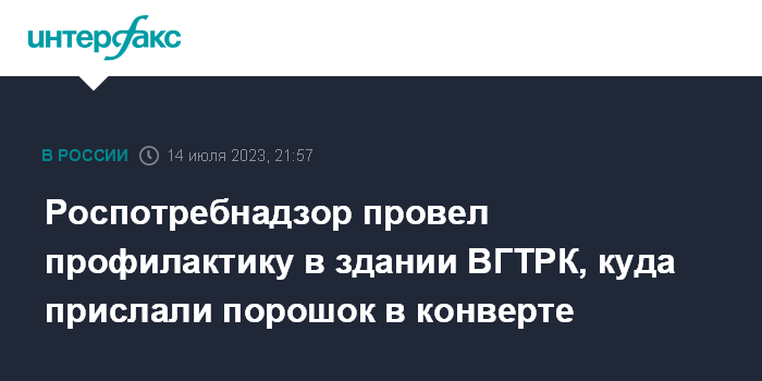 Роспотребнадзор провел профилактику в здании ВГТРК, куда прислали порошок в конверте