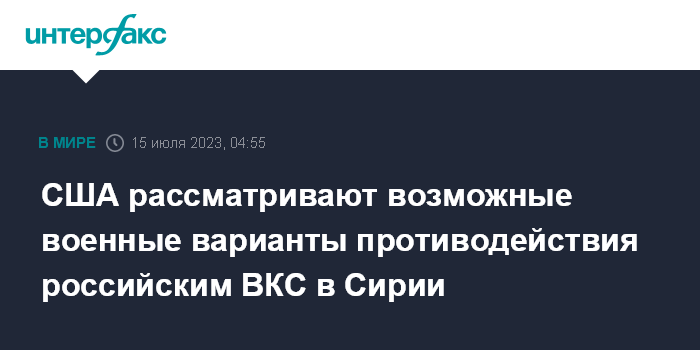 Москва. 15 июля. INTERFAX.RU - Представитель Пентагона заявил журналистам, что Соединенные Штаты рассматривают ряд военных вариантов для противодействия растущей российской активности в небе над Сирией, сообщает агентство Associated Press (AP).