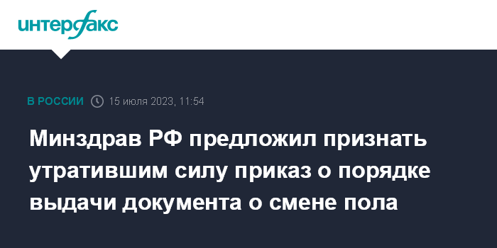 Москва. 15 июля. INTERFAX.RU - Минздрав России предлагает признать утратившим силу приказ о форме и порядке выдачи медицинской организацией документа об изменении пола.