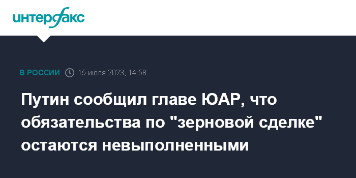 Путин сообщил главе ЮАР, что обязательства по "зерновой сделке" остаются невыполненными