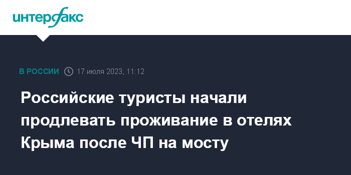 Москва. 17 июля. INTERFAX.RU - Российские туристы продлевают проживание в отелях Крыма из-за задержек в пути, которые возникли после ЧП на мосту, сообщили "Интерфаксу" в пресс-службе туроператора "Интурист".
