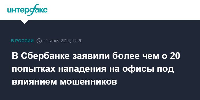 Москва. 17 июля. INTERFAX.RU - С начала года Сбербанк зарегистрировал более 20 попыток нападения на свои офисы по указанию мошенников, сообщили в банке в понедельник.