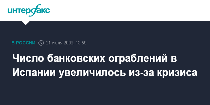 Барселона. 21 июля. INTERFAX.RU - В Испании отмечается существенное увеличение числа банковских ограблений, пишет газета The New York Times. Число таких преступлений в первом полугодии 2009 года на 20% превысило уровень, зафиксированный по итогам аналогичного периода 2007 года.