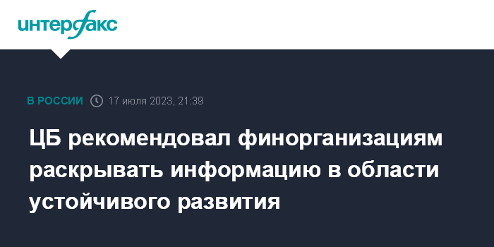 Москва. 17 июля. INTERFAX.RU - Банк России опубликовал рекомендации для финансовых организаций по раскрытию информации в области устойчивого развития. Они адресованы банкам, страховщикам, управляющим компаниям, негосударственным пенсионным фондам, брокерам.
