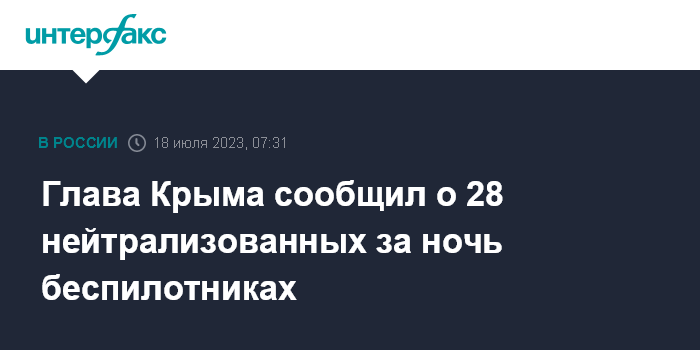 Москва. 18 июля. INTERFAX.RU - Российские военные нейтрализовали за ночь в восточной части Крыма 28 беспилотников, сообщил глава республики Сергей Аксенов.