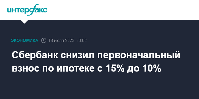 Москва. 18 июля. INTERFAX.RU - Сбербанк сообщил, что снизил минимальный первоначальный взнос по ипотеке с 15% до 10%.