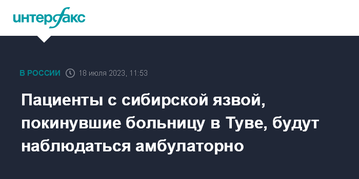 Москва. 18 июля. INTERFAX.RU - Пациенты с сибирской язвой, самовольно покинувшие Республиканскую инфекционную больницу Тувы, взяты под амбулаторное наблюдение, сообщила пресс-служба министерства здравоохранения республики.