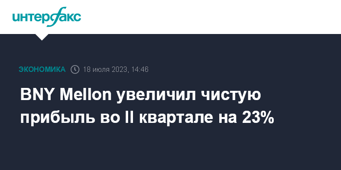 Москва. 18 июля. INTERFAX.RU - Во II квартале 2023 года Bank of New York Mellon (BNY Mellon), крупнейший в мире банк-кастодиан, увеличил чистую прибыль на 23% благодаря росту процентного дохода, а также сокращению расходов.