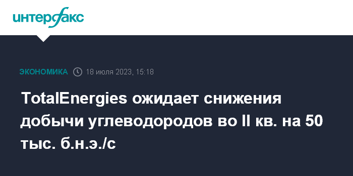 Москва. 18 июля. INTERFAX.RU - Французская TotalEnergies прогнозирует сокращение добычи углеводородов во втором квартале 2023 года на 50 тысяч баррелей нефтяного эквивалента в сутки (б.н.э./с) к первому кварталу, до приблизительно 2,5 млн б.н.э./с, главным образом из-за планового техобслуживания в Северном море.