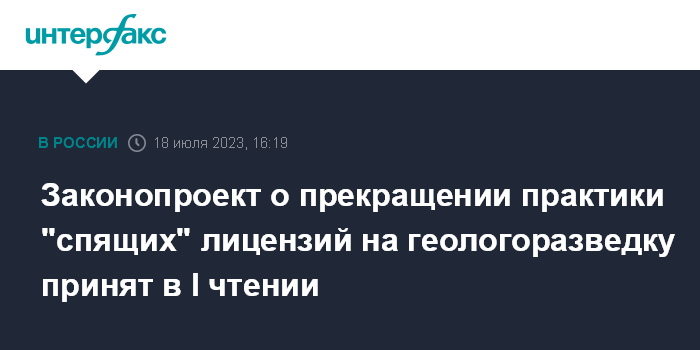 Москва. 18 июля. INTERFAX.RU - Госдума приняла в первом чтении поправки в закон "О недрах", которые разработаны Минприроды с целью прекращения практики "спящих" лицензий на геологоразведку.