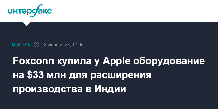 Москва. 18 июля. INTERFAX.RU - Тайваньская Foxconn Technology Group, производитель электроники и крупнейший сборщик iPhone, в течение 2022 года приобрела у Apple оборудование на сумму $33 млн.