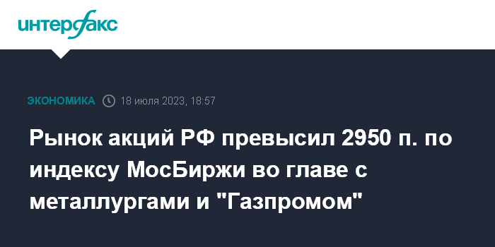 Москва. 18 июля. INTERFAX.RU - Рынок акций РФ во вторник продолжил подъем на фоне улучшения внешней фондовой и нефтяной конъюнктуры (нефть Brent отскочила выше $79,5 за баррель), а также ряда корпоративных новостей. Индекс МосБиржи превысил рубеж 2950 пунктов, обновив максимум с февраля 2022 года, локомотивом роста выступили бумаги металлургов и "Газпрома".