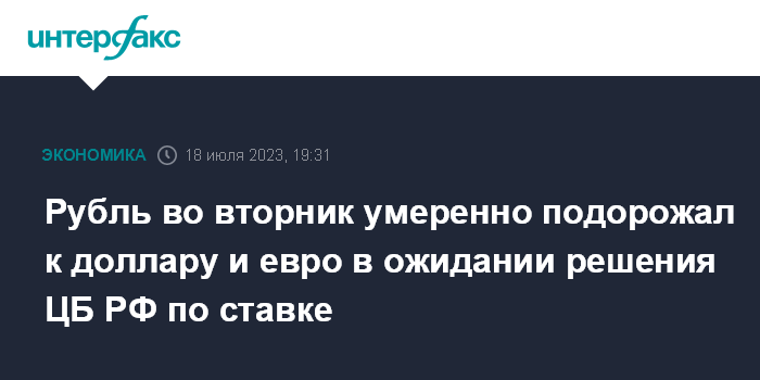 Как отмечают эксперты "Интерфакс-ЦЭА", рубль подрос к доллару и евро по итогам торгов вторника в ожидании заседаний ведущих мировых центробанков. В пятницу, 21 июля, заседание по ключевой ставке проведет Банк России, по его итогам пройдет пресс-конференция председателя ЦБ Эльвиры Набиуллиной. Позднее заседания проведут Федеральная резервная система (ФРС) США и Европейский центральный банк (ЕЦБ).