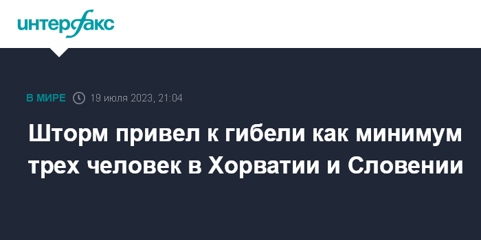 Москва. 19 июля. INTERFAX.RU - Мощный шторм принес сильный ветер и проливные дожди в Хорватию и Словению, из-за чего погибли не менее трех человек, сообщает в среду Associated Press.