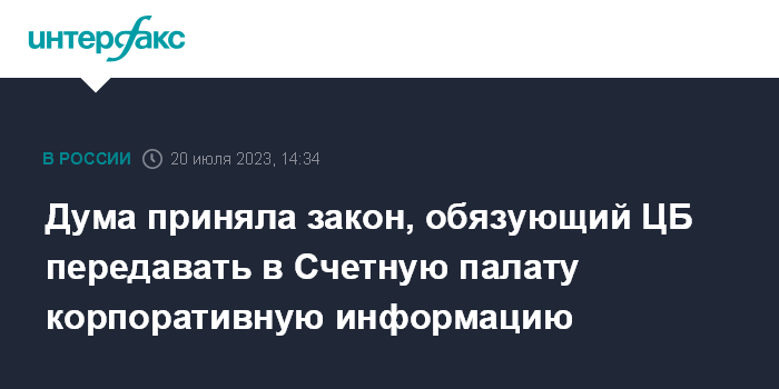 Москва. 20 июля. INTERFAX.RU - Госдума приняла во втором и третьем чтении законопроект, который обязывает Банк России передавать Счетной палате (СП) корпоративную информацию, которая раскрывается эмитентами в ограниченном объеме.