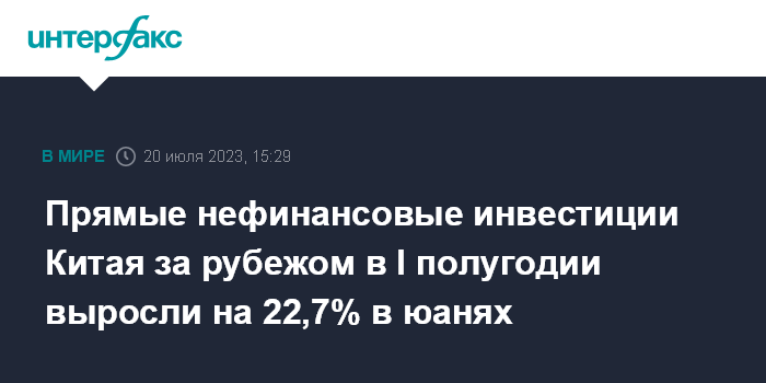 Прямые нефинансовые инвестиции Китая за рубежом в I полугодии выросли на 22,7% в юанях
