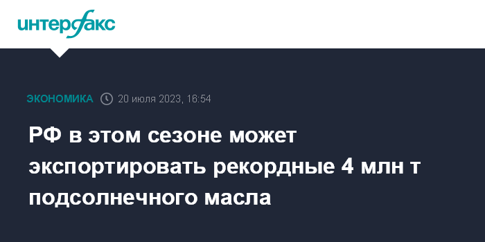 Москва. 20 июля. INTERFAX.RU - Россия 2022/2023 сельхозгоду (по масличным - сентябрь-август) может экспортировать 4 млн тонн подсолнечного масла, что станет рекордным показателем, сообщил генеральный директор Института конъюнктуры аграрного рынка (ИКАР) Дмитрий Рылько на летней конференции "Где маржа 2023" в четверг в Москве.