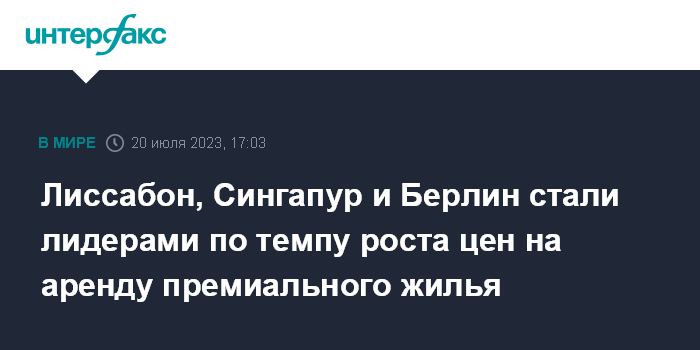 Москва. 20 июля. INTERFAX.RU - Лиссабон, Сингапур и Берлин возглавили рейтинг городов с самыми высокими темпами роста цен на аренду жилья премиум-класса в первом полугодии 2023 года, говорится в отчете агентства недвижимости Savills.