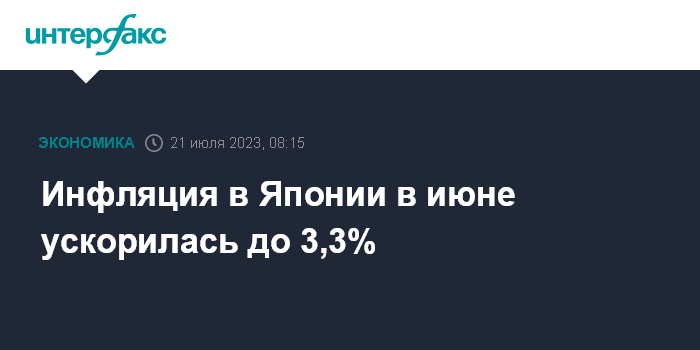 Москва. 21 июля. INTERFAX.RU - Потребительские цены в Японии в июне выросли на 3,3% в годовом выражении, говорится в отчете министерства внутренних дел и коммуникаций страны.