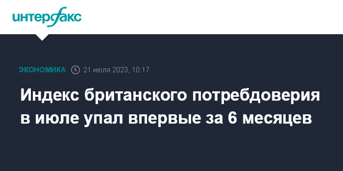 Москва. 21 июля. INTERFAX.RU - В июле 2023 года индекс потребительского доверия в Великобритании снизился впервые за полгода на фоне устойчиво высокой инфляции в стране и роста процентных ставок.