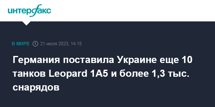Москва. 21 июля. INTERFAX.RU - Германия направила Украине дополнительно 10 танков Leopard 1A5, порядка 1,3 тыс. снарядов калибра 155 мм, а также более 2 тыс. дымовых боеприпасов, сообщило Минобороны ФРГ в пятницу.