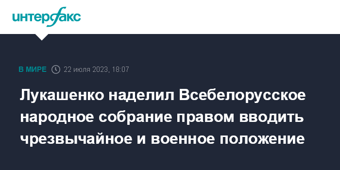 Москва. 22 июля. INTERFAX.RU - Президент Белоруссии Александр Лукашенко наделил Всебелорусское народное собрание (ВНС) полномочиями утверждать военную доктрину, вводить чрезвычайное и военное положение в республике, направлять военнослужащих за пределы страны.